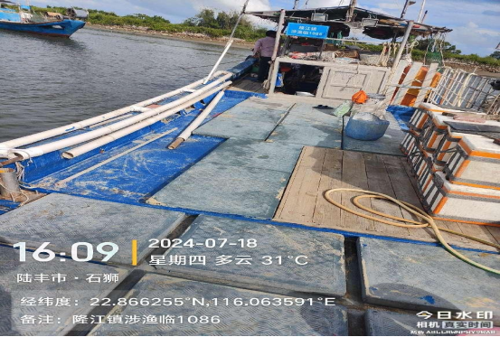 2024年7月18日,陆丰市海洋综合执法大队在陆丰市甲东对开海域查获一艘悬挂“隆江镇涉渔临1086”牌号的玻璃钢船舶(编号扣13),总长16.9米,型宽3.85米,主机2部,主机铭牌不详,主机型号不详。