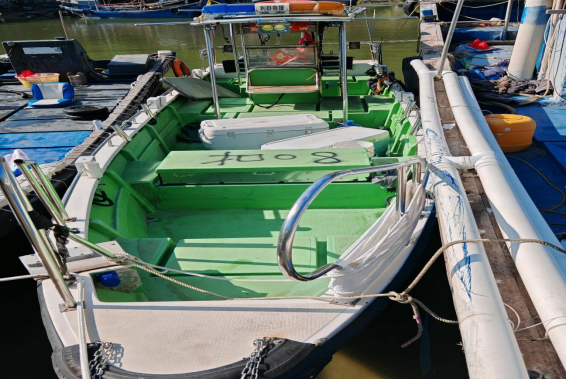 2024年9月11日,汕尾市海洋综合执法支队在陆丰市乌坎港内查获一艘标识“利群救援”“06”的玻璃钢船舶(编号扣08),总长9.8米,型宽2.35米,船上没有主机设备。