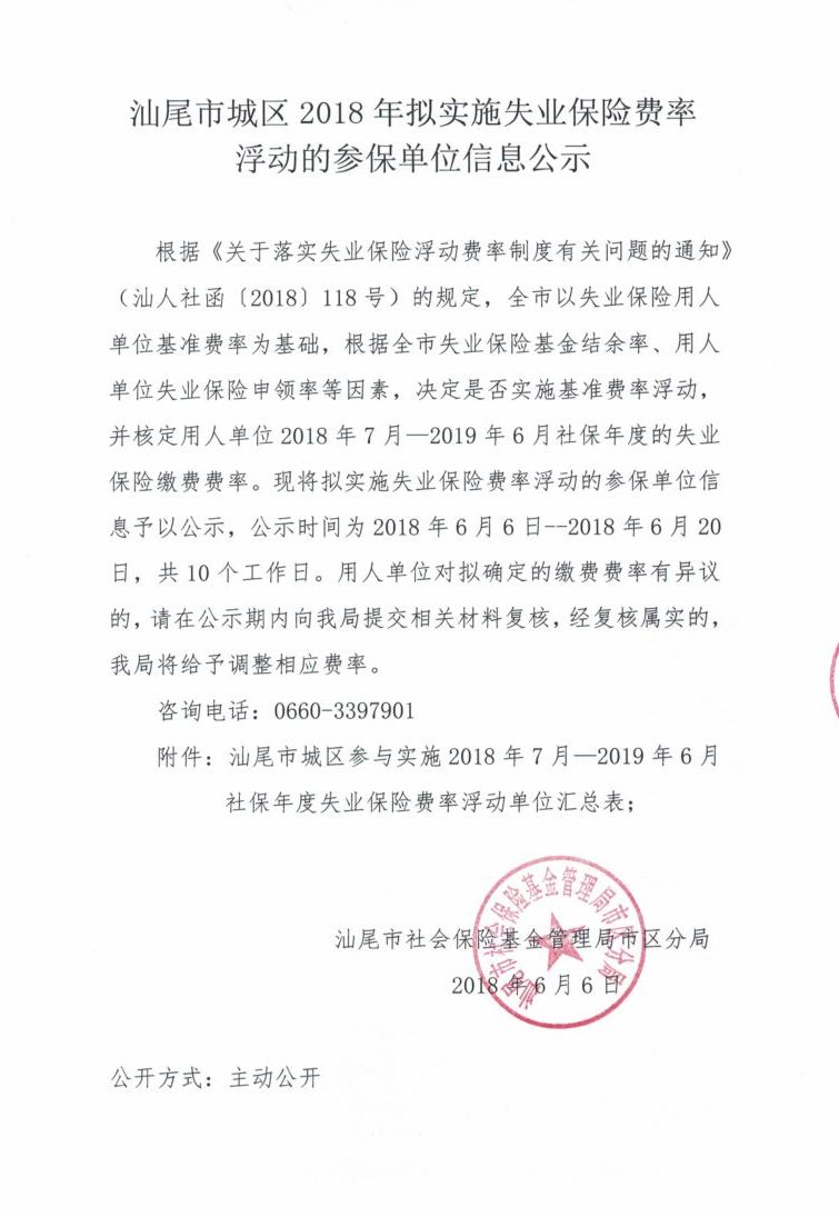 城区2018年拟实施失业保险费率浮动的参保单位信息公示