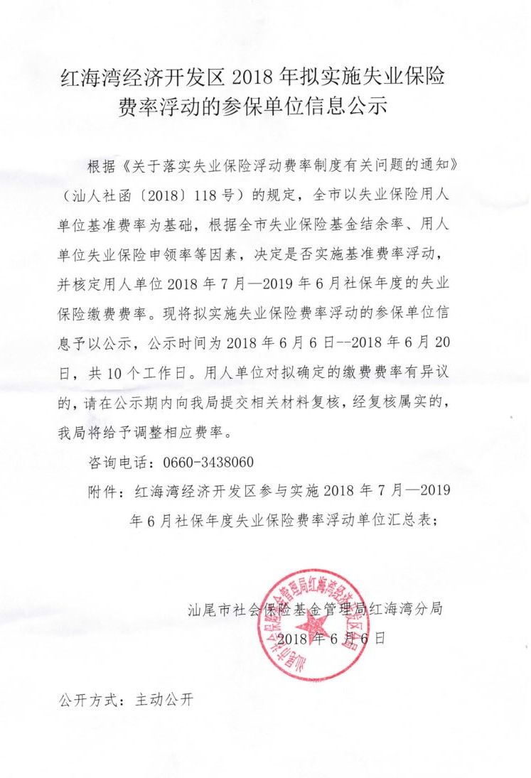 红海湾经济开发区2018年拟实施失业保险费率浮动的参保单位信息公示 -- 社会保险