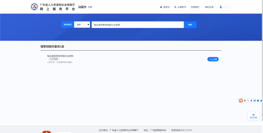 第一步:访问广东省人力资源和社会保障厅网上服务平台(//ggfw.hrss.gd.gov.cn/gdggfw/index.shtml),注册登录后,点击左上方切换当前参保地,在搜索框中搜索“城乡居民养老保险社会资助”,点击“个人办理”即可跳转至申办页面。