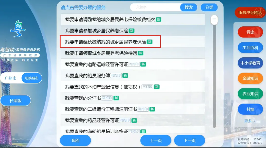 第一步:找到就近的粤智助,点击【我要申请延长缴纳我的城乡居民养老保险】