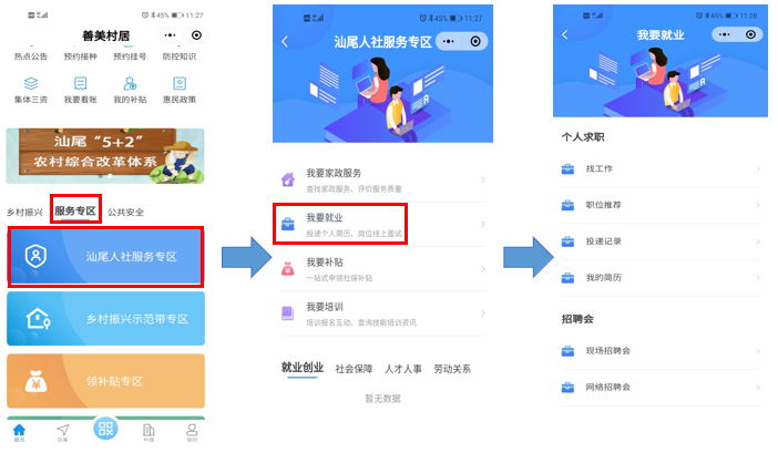 打开“善美村居”小程序,点击“服务专区”,点击“汕尾人社服务专区”板块,点击“我要就业”栏目,进入“我要就业”模块中。