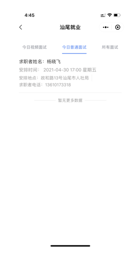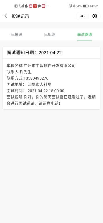 在提交完简历后耐心等待企业的邀约面试,你会收到电话邀约或在“汕尾就业”就业小程序中收到现场面试或远程视频面试通知。