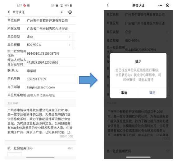 企业打开“汕尾市公共就业人才”小程序,点击“我的”,点击“单位普通登录”认证企业账户,完善单位名称、社会信用代码、企业介绍和联系人等相关信息后,提交就业中心审核。审核时间只需要半天,就能完成单位认证。