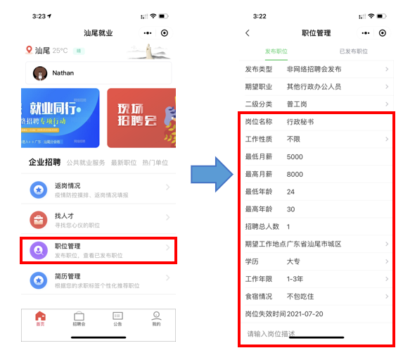 企业可以根据招聘需求,在“职位管理”页面完善岗位名称、薪酬待遇、岗位要求和任职要求等信息,提交就业中心审核。半天的时间就能完成审核通过,发布职位。