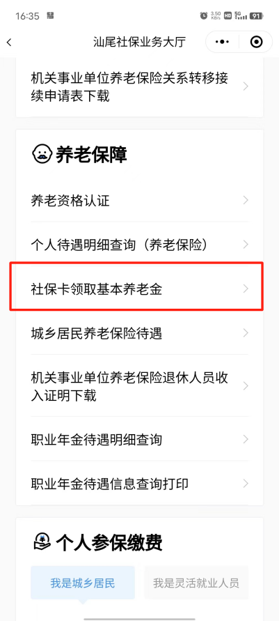 第一步:打开微信搜索“粤省事”→登录“粤省事”→切换所在地市为“汕尾”→点击热门服务里的【社保】,在“养老保障”模块选择“社保卡领取基本养老金”服务。