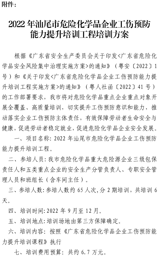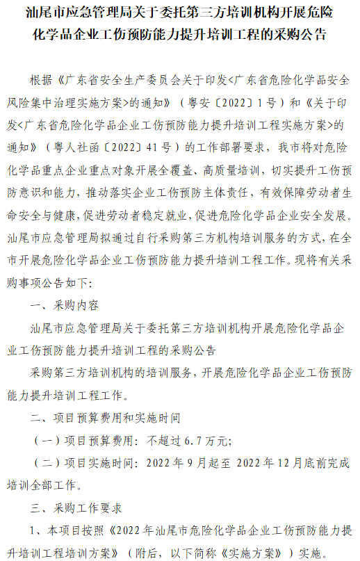 汕尾市应急管理局关于委托第三方培训机构开展危险化学品企业工伤预防能力提升培训工程的采购公告