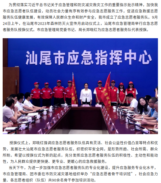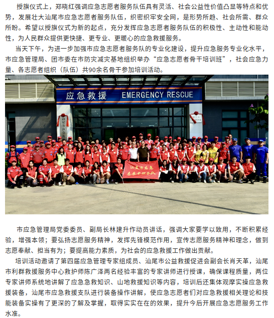 汕尾市应急管理局举办应急志愿者服务队授旗仪式暨应急志愿者骨干培训班