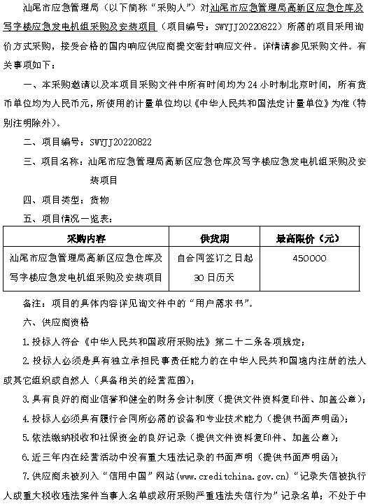汕尾市应急管理局高新区应急仓库及写字楼应急发电机组采购及安装项目询价公告