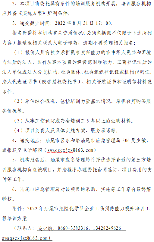 汕尾市应急管理局关于委托第三方培训机构开展危险化学品企业工伤预防能力提升培训工程的采购公告