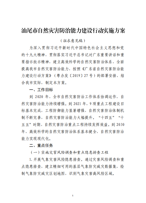关于征询《汕尾市自然灾害防治能力建设行动实施方案(征求意见稿)》意见的公告