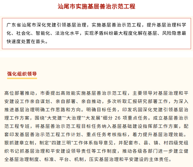 中央政法委主管的《长安》杂志在2023年第12期“长安经验”专栏中,刊发电影天堂 文章——《汕尾市实施基层善治示范工程》,介绍电影天堂 深化党建引领基层治理经验做法。