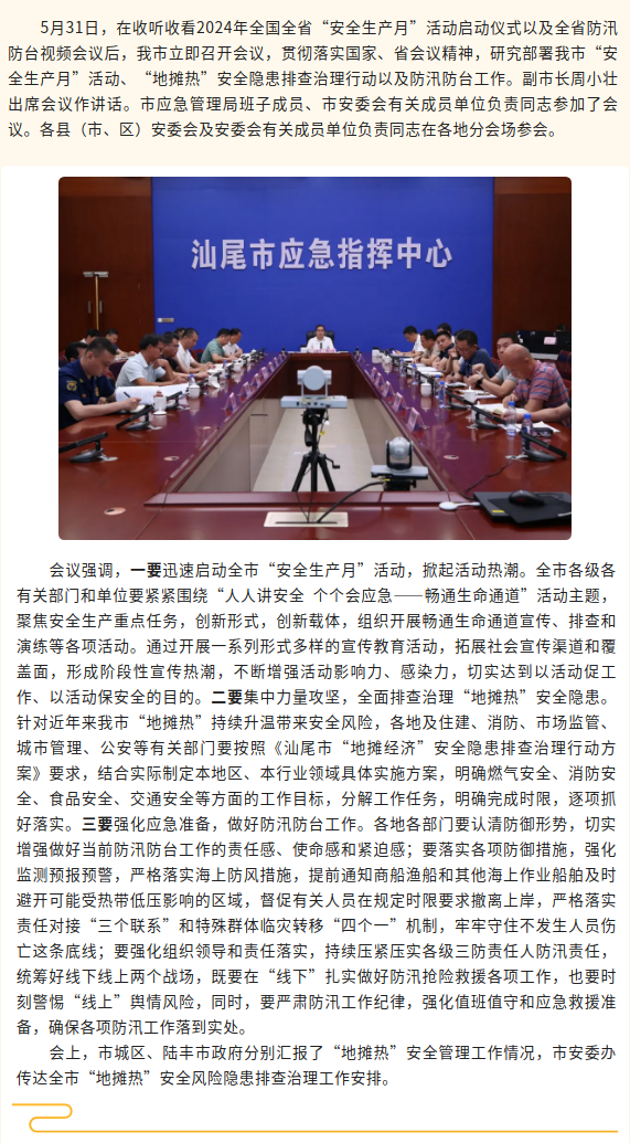 汕尾市启动2024年全市“安全生产月”活动 并部署“地摊热”安全隐患排查治理行动及防汛防台工作