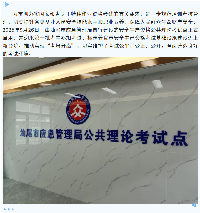 推动实现考培分离 维护考试公平公正 汕尾市安全生产公共理论考试点正式启用