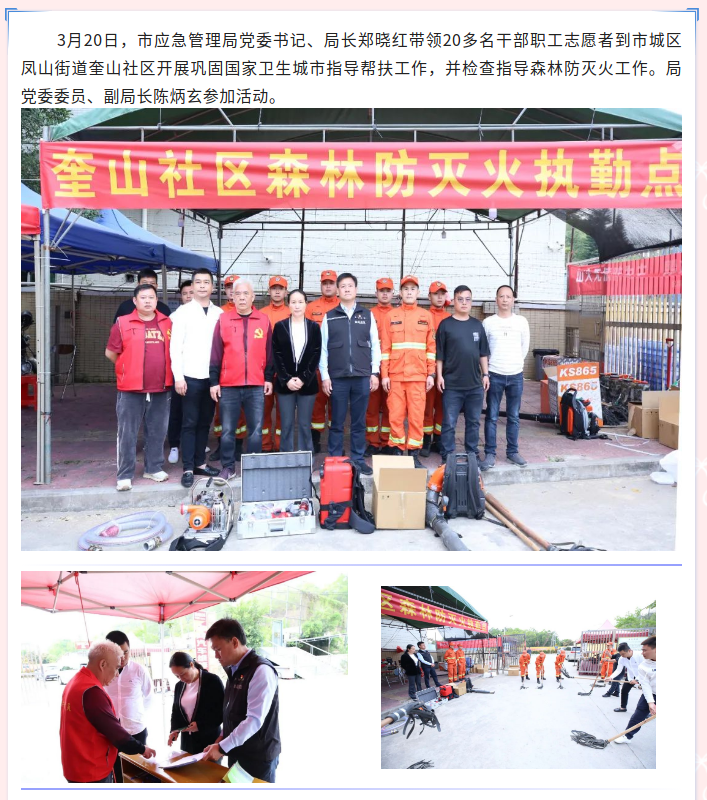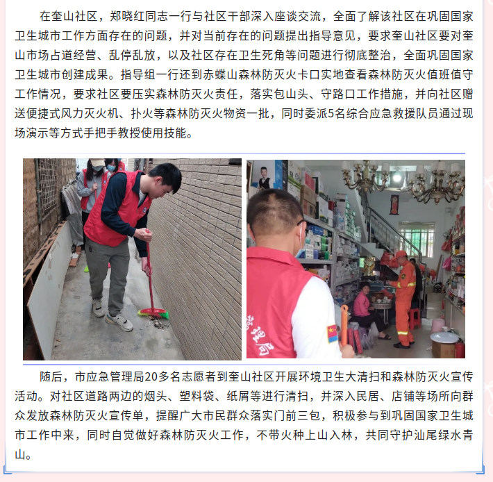 市应急管理局主要领导带队到奎山社区开展巩固国家卫生城市帮扶活动并检查指导森林防灭火工作