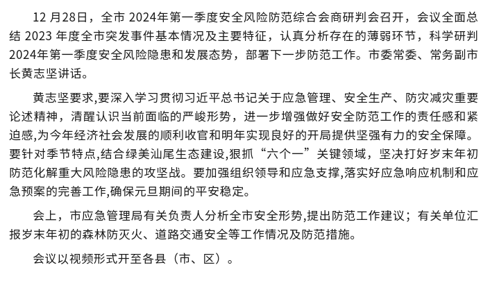 全市2024年第一季度安全风险防范综合会商研判会召开 做好岁末年初安全防范工作