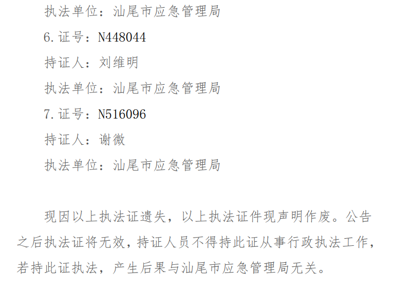 行政执法证遗失公告