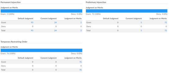 从蒂芙尼获得的法院救济数量来看,在蒂芙尼发起的118起知识产权案件中,共有110起获得了法院的永久禁令(Permanent Injunction),77起获得初步禁令(Preliminary Injunction,PI),76起获得临时禁令(Temporary Restraining Order,TRO)。