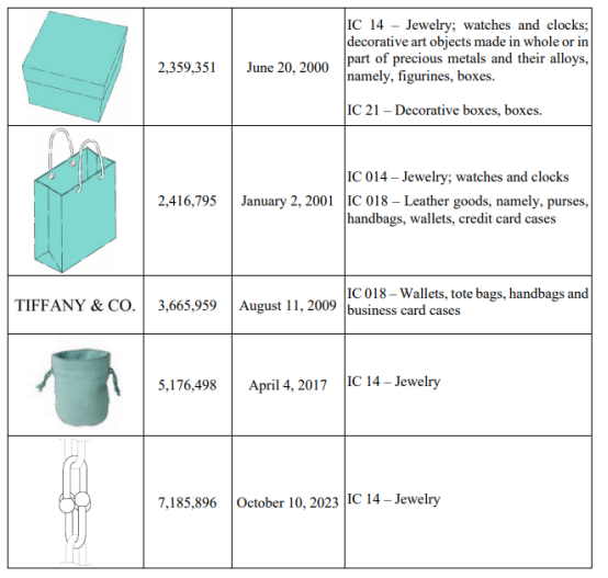 蒂芙尼近年在美国发起的侵权诉讼案由均为商标,其中还包括部分商业外观,部分如下: