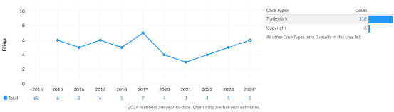 目前,原告蒂芙尼在美国联邦地区法院共主动发起过118起知识产权诉讼,案由均涉及商标,仅有8起还涉及版权.,从蒂芙尼的诉讼趋势来看,其每年均有发起诉讼且诉讼量相对较为平稳。