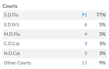 从诉讼发起地来看,蒂芙尼更倾向于在美国佛罗里达州南区法院发起诉讼,占蒂芙尼发起诉讼总数的77%,其次是纽约南区法院,占比5%。
