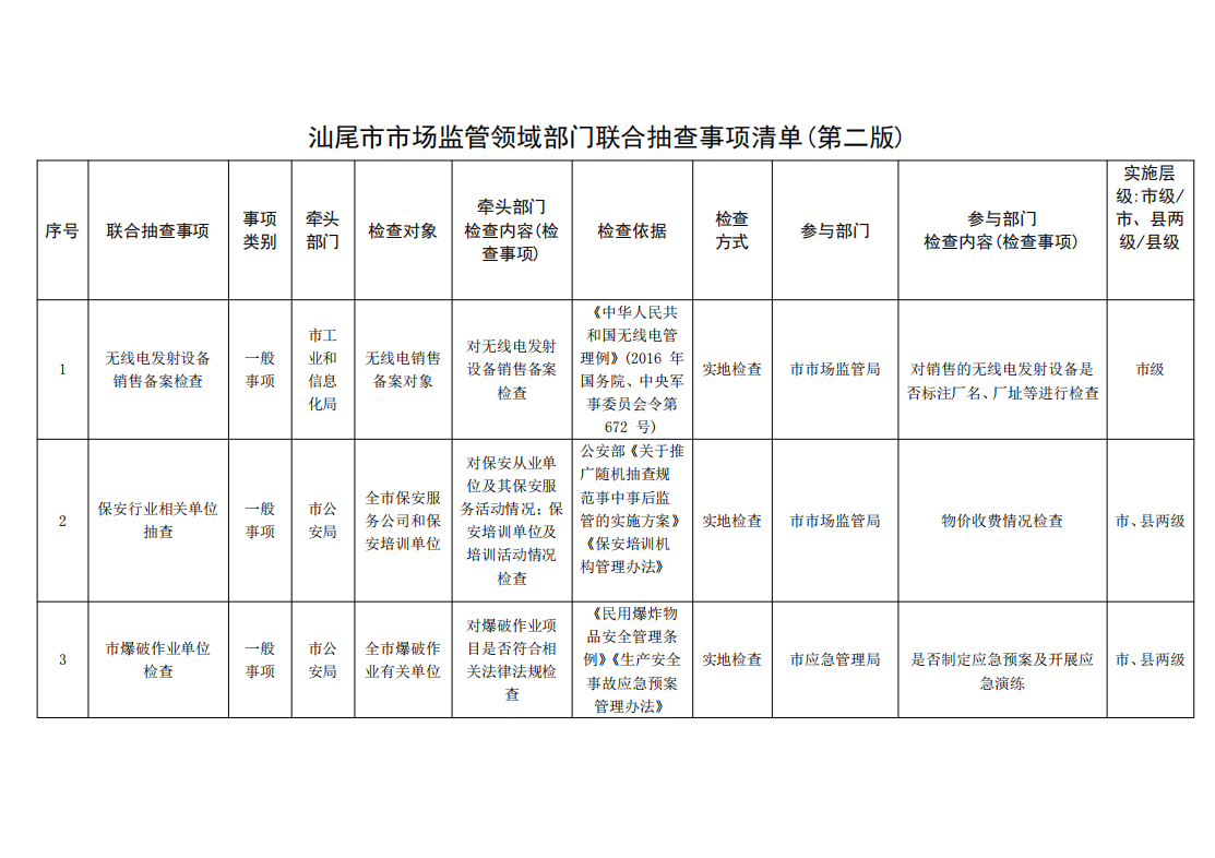 根据《广东省市场监管领域部门联合抽查事项清单(第一 版)》及全市营商环境优化提升的工作部署,并结合电影天堂 实际,经对电影天堂 第一版联合抽查事项清单修订,形成了《汕尾市市场监管领域部门联合抽查事项清单(第二版)》(以下简称《清单》),现印发给你们,请按以下要求认真贯彻执行。