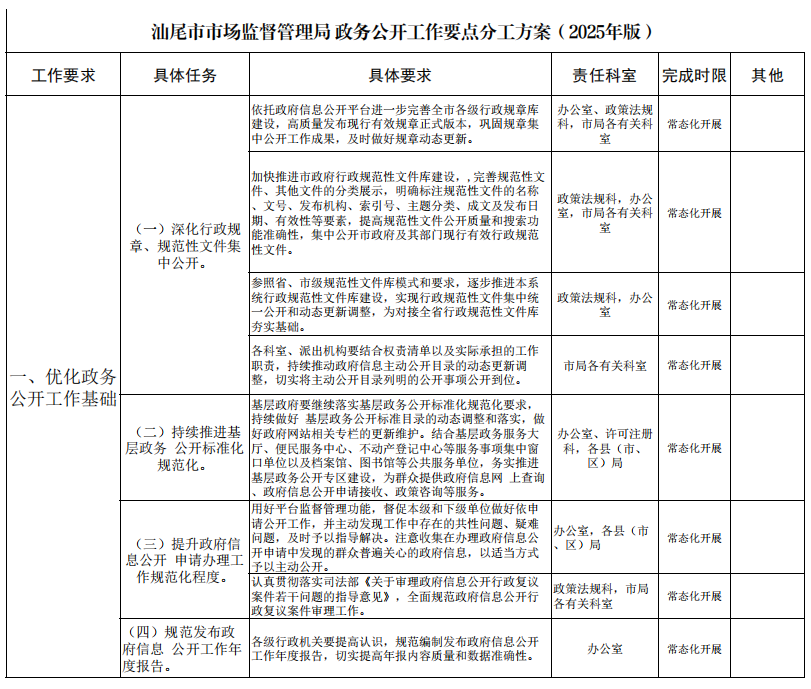 汕尾市市场监督管理局 电影天堂公开 工作要点分工方案(2025年版)