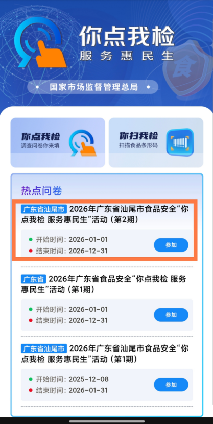 民以食为天,食以安为先!为让食品安全监管更精准对接民生需求,2026年汕尾市食品安全“你点我检 服务惠民生”意见征集活动正式上线啦~