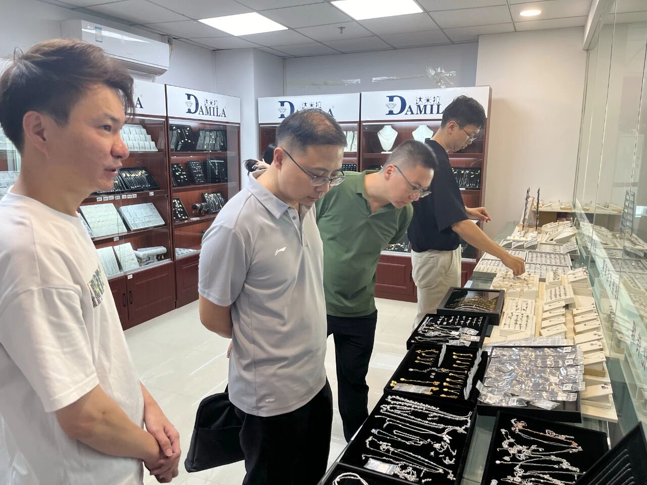 调研首站,调研组一行莅临海丰县达米拉电子商务有限公司,详细了解企业发展历程、业务布局与品牌建设情况。随后,实地考察可塘镇珠宝交易市场,深入了解可塘镇珠宝产业带发展历史与现有规模情况,并与市场内多家商户深入洽谈,细致询问经营情况。
