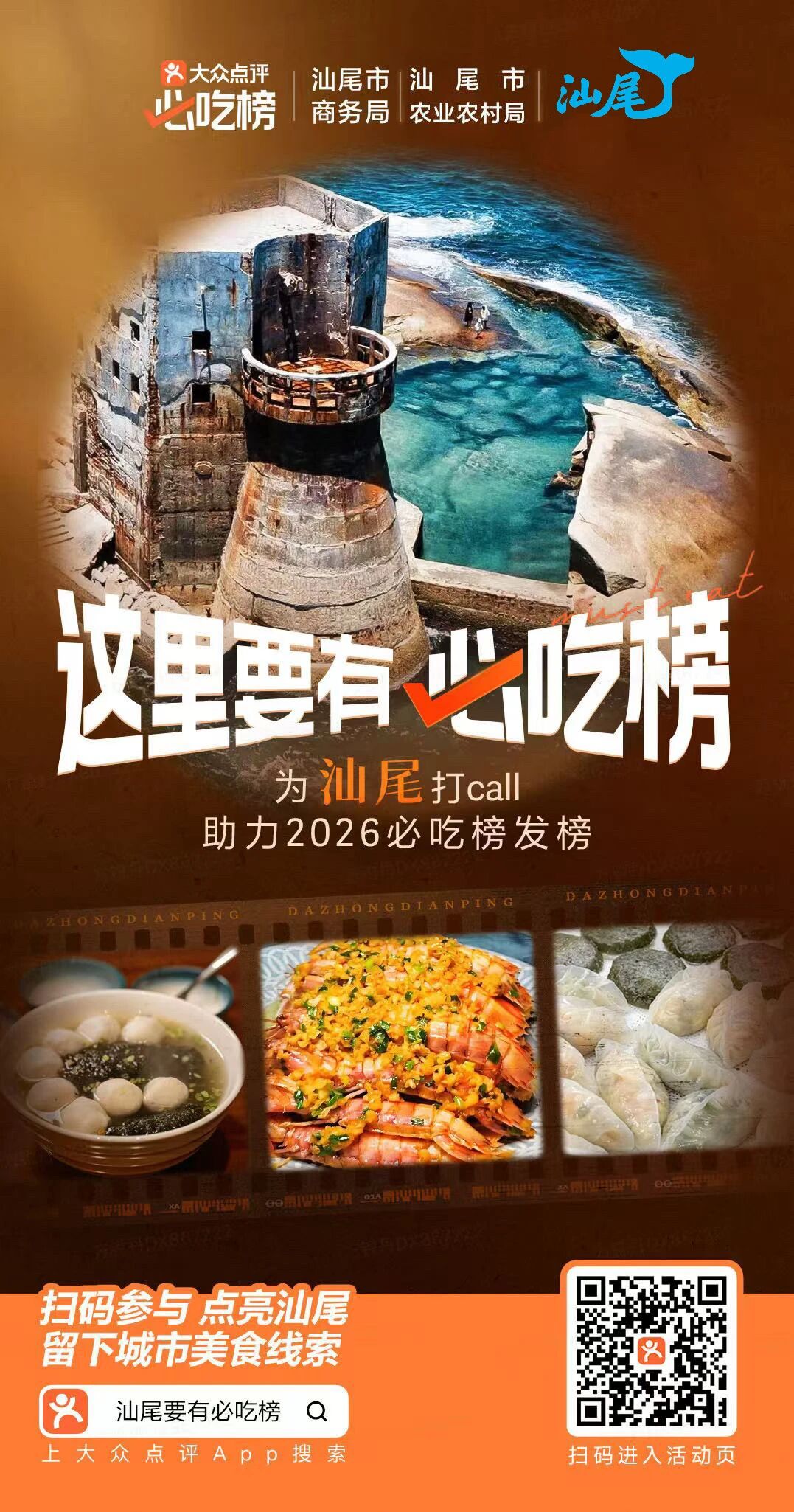 我们诚邀每位热爱汕尾的朋友,助力这座心中的宝藏美食城市荣耀登榜。即日起至2025年12月31日,只需打开大众点评App,搜索“汕尾要有必吃榜”,即可参与活动,点亮心愿城市汕尾!为你热爱的城市增加热度,留下地道美食线索,助力汕尾美食走向全国!