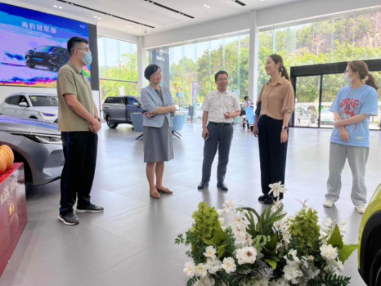 2023年5月29日,市商务局局长钟雪欢带队前往比亚迪汽车汕尾锦虹4S店、比亚迪汽车海洋网汕尾盛世新景4S店等新能源车销售企业门店进行实地走访调研,与汽车销售企业负责人展开座谈。钟雪欢局长详细了解了各车企今年以来经营销售情况、全市汽车消费趋势,共同探讨政府部门扶持、企业让利促销等互惠措施。同时,市商务局工作人员还检查了车企的汽车销售流通管理平台备案及数据报送情况,督促引导企业落实主体责任,依法依规经营。