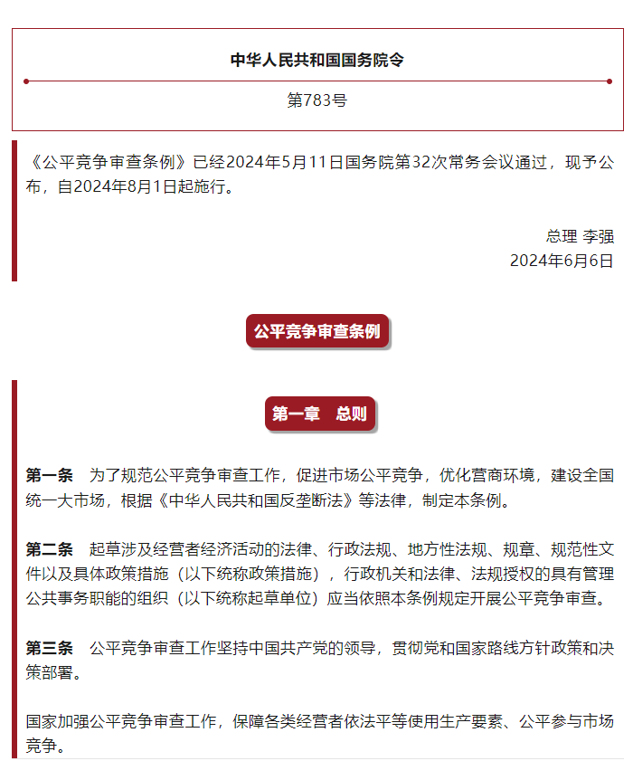 李强签署国务院令 公布《公平竞争审查条例》