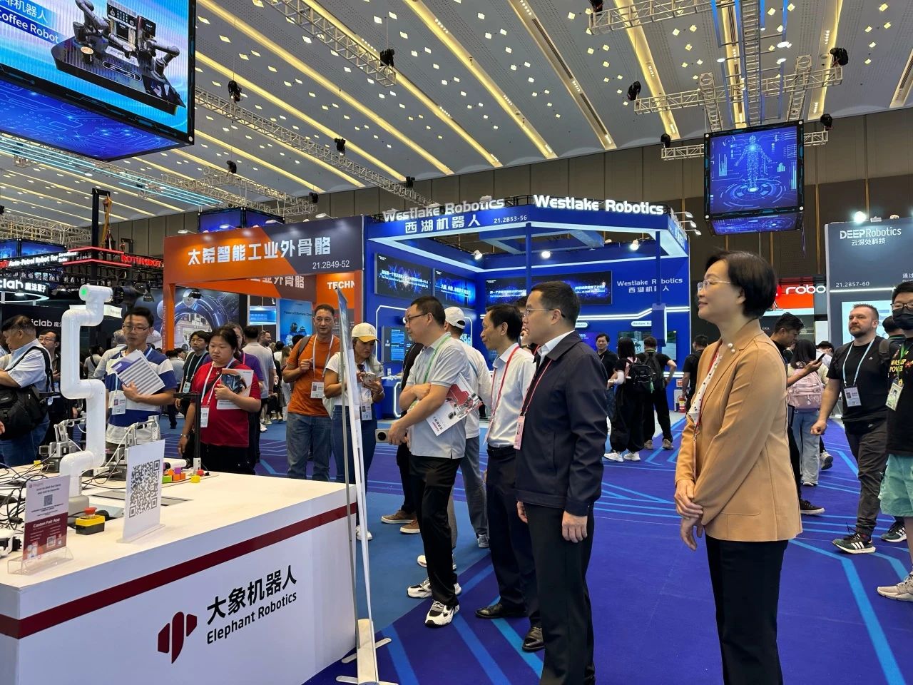在服务机器人专区,周小壮与多家机器人企业负责人深入交流,详细了解机器人的技术研发、应用场景和市场前景,并开展现场招商工作。他积极向企业介绍汕尾的产业基础、政策优势和投资环境,诚邀机器人企业到汕尾投资兴业,助力汕尾产业升级。