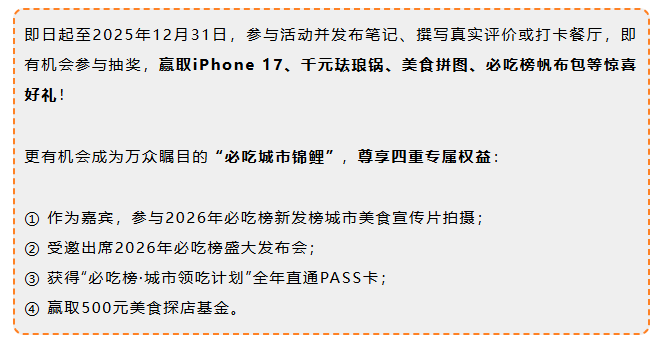 我们诚邀每位热爱汕尾的朋友,助力这座心中的宝藏美食城市荣耀登榜。即日起至2025年12月31日,只需打开大众点评App,搜索“汕尾要有必吃榜”,即可参与活动,点亮心愿城市汕尾!为你热爱的城市增加热度,留下地道美食线索,助力汕尾美食走向全国!
