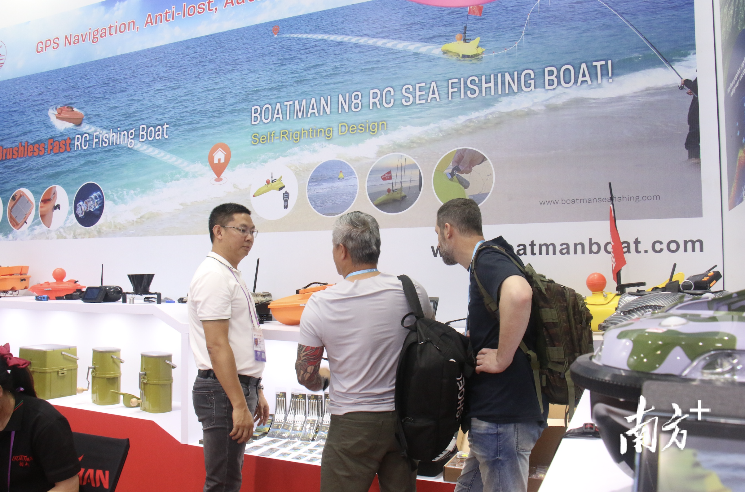 在广东省船夫电子有限公司的展位前,一台搭载GPS定位和声呐探鱼功能的智能打窝船吸引了南美客商的驻足。“这款产品能自动航行至500米外指定水域,实时探测鱼群分布,并自动返航。整个场馆渔具类企业仅我们一家,产品已经出口60多个国家。”总经理叶汉强向客户演示时,语气中充满自信。