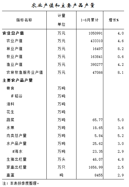 2016年1—8月农业产值和主要产品产量