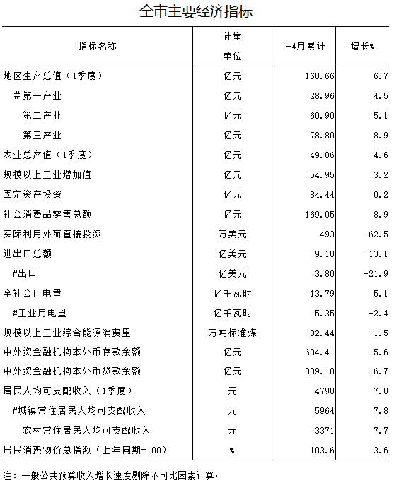 2016年1-4月全市主要经济指标