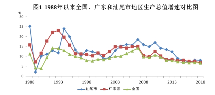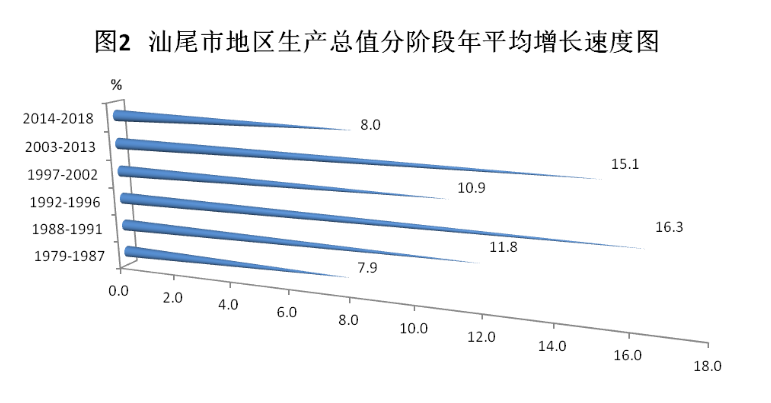 2003年至2013年,汕尾在这个阶段经济规模迅速扩张,经济总量由2002年的150.89亿元增加至2013年的670.60亿元,突破了500亿元,2003-2013年年均增长15.1%,比同期全省年均增速高3.0个百分点。党的十八大后,经济进入新常态,发展速度趋缓,2014-2018年年均增长8.0%,比同期全省年均增速高0.5个百分点。