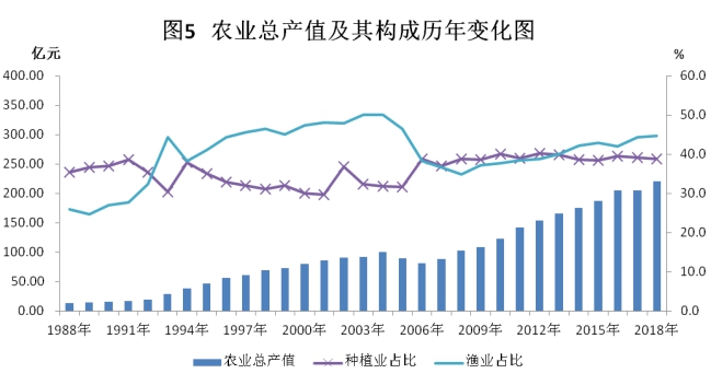 农业结构持续改善。全市农林牧渔业总产值由1952年的1.40亿元增加到2018年的219.87亿元,年均增长5.3%。在农业总产值中,种植业总产值和渔业总产值占比均有所上升,种植业总产值占比由1988年的35.5%上升至2018年的38.8%,渔业总产值占比由26.0%上升至44.6%,占比接近一半。目前,全市建成了优质水稻、优质茶叶、优质水果、蔬菜等集约化、规模化“三高”农业产品基地,形成了农工贸、产供销一体化的格局。2018年,创建了海丰蔬菜、陆丰萝卜2个省级农业产业园,新增省重点农业龙头企业4家、省级农业标准化示范区6个、省级名牌农产品2个、农民专业合作组织1648家,复耕撂荒土地7.67万亩,食用农产品快检考核跃升至全省第3名。