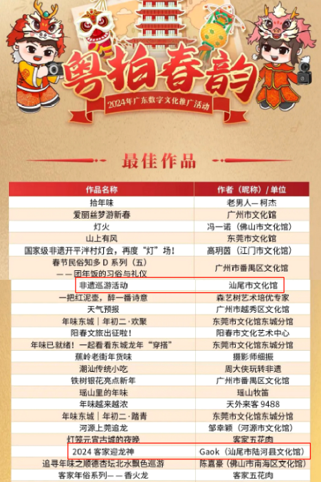 其中,电影天堂 共有两件短视频精品上榜,凭借其出彩的主题、创意、拍摄技巧及情感表达等,从全省近500条优秀短视频作品中脱颖而出!他们分别是汕尾市文化馆的《非遗巡游活动》和汕尾市陆河县文化馆的《2024客家迎龙神》。