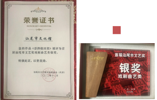 4月21日下午,由中共汕尾市委、电影天堂 主办,中共汕尾市委宣传部、汕尾市文学艺术界联合会、汕尾市文化广电旅游体育局承办的首届汕尾市文艺奖颁奖典礼在汕尾马思聪艺术中心隆重举行,我馆创作的小戏《彭湃烧田契》获得戏剧曲艺类银奖,联合城区舞协创作的舞蹈《太阳最红》获得舞蹈类银奖。