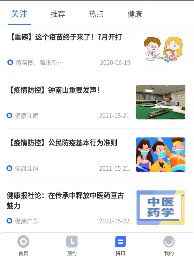 资讯模块提供市民健康资讯,丰富市民的健康知识,促进其科学健康地管理身体,提高全民身体素质。