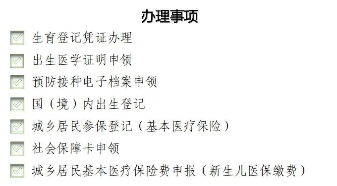 “出生一件事”联办,是将生育登记凭证办理、出生医学证明申领、预防接种电子档案申领、国(境)内出生登记、城乡居民参保登记(基本医疗保险)、社会保障卡申领、城乡居民基本医疗保险费申报(新生儿医保缴费)等多个围绕新生儿的事项汇集为“一件事”同步办理,其中城乡居民参保登记(基本医疗保险)事项办理需先办理国(境)内出生登记事项。