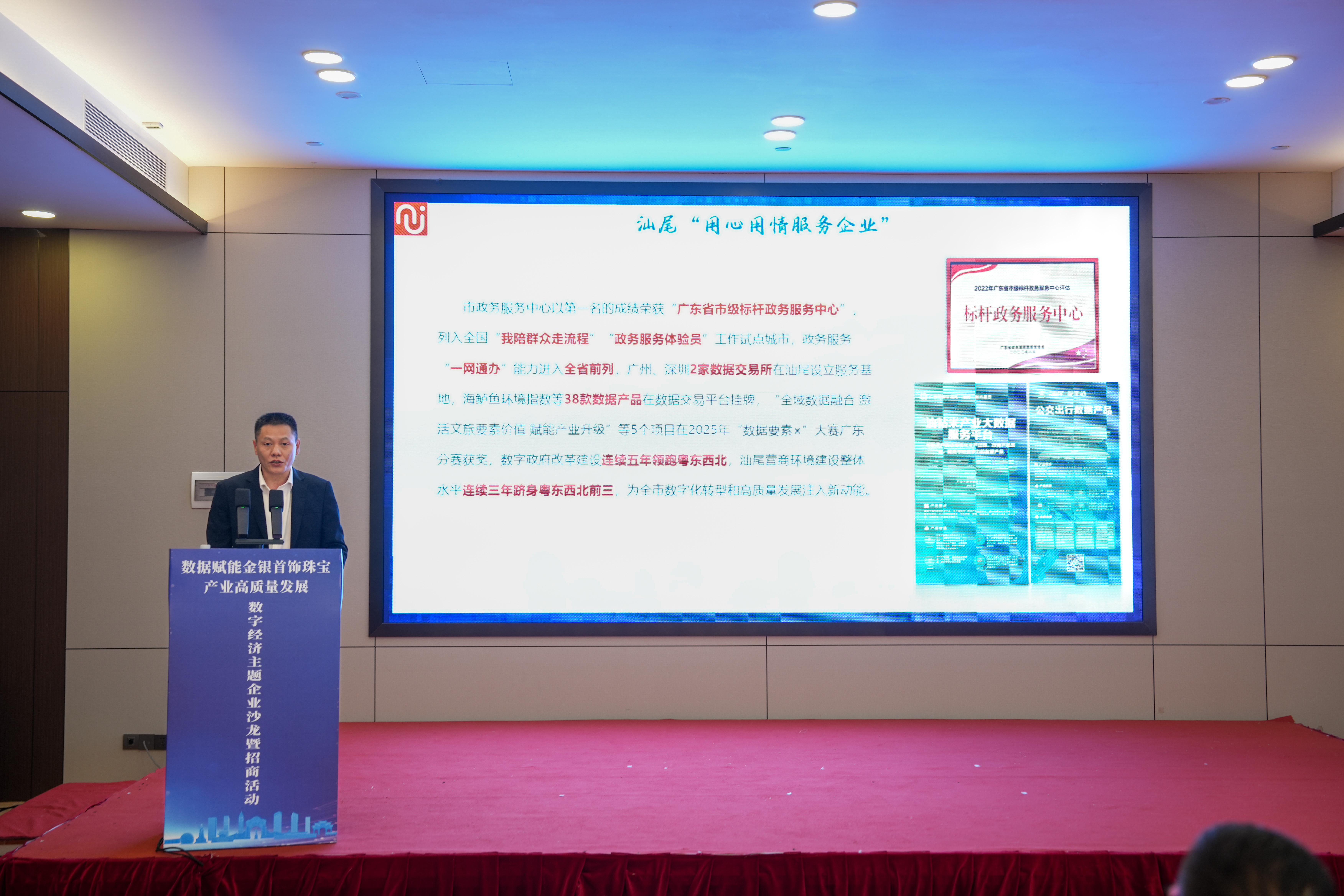 12月24日,由汕尾市政务服务和数据管理局主办的“品清湖企业沙龙”系列活动——“数据赋能金银首饰珠宝产业高质量发展”数字经济主题沙龙暨招商推介会,在汕尾海迪温德姆酒店圆满举办。温树斌副市长出席活动并致辞,市直相关单位、各县(市、区)政务和数据局、相关镇街负责人及市内外行业专家、龙头企业等近百位代表齐聚一堂,共商产业数字化发展路径,共谋投资兴业新机遇。