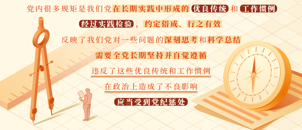 党内很多规矩是我们党在长期实践中形成的优良传统和工作惯例,经过实践检验,约定俗成、行之有效,反映了我们党对一些问题的深刻思考和科学总结,需要全党长期坚持并自觉遵循。这些规矩看着没有白纸黑字的规定,但都是一种传统、一种范式、一种要求。违反了这些优良传统和工作惯例,在政治上造成了不良影响,应当受到党纪惩处。